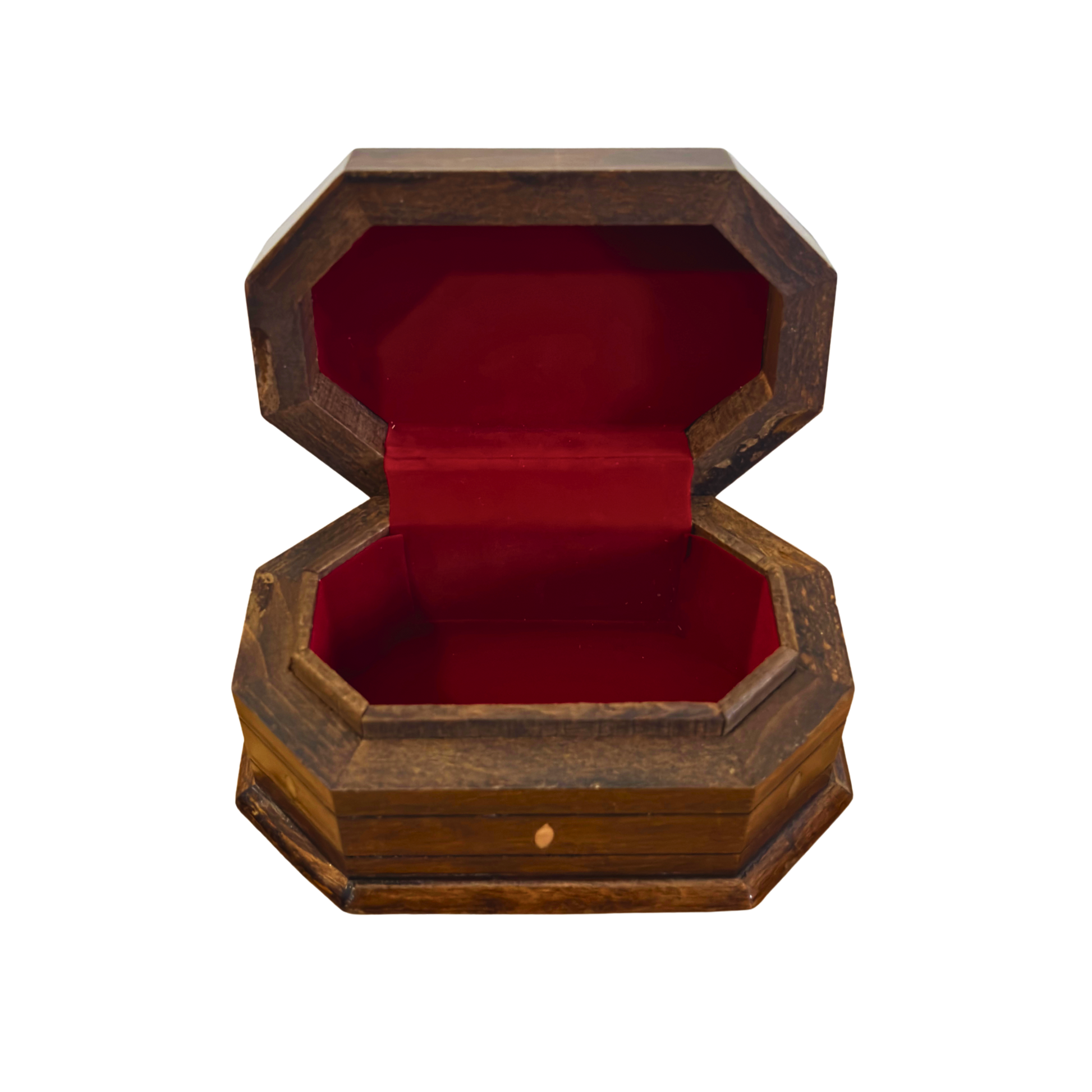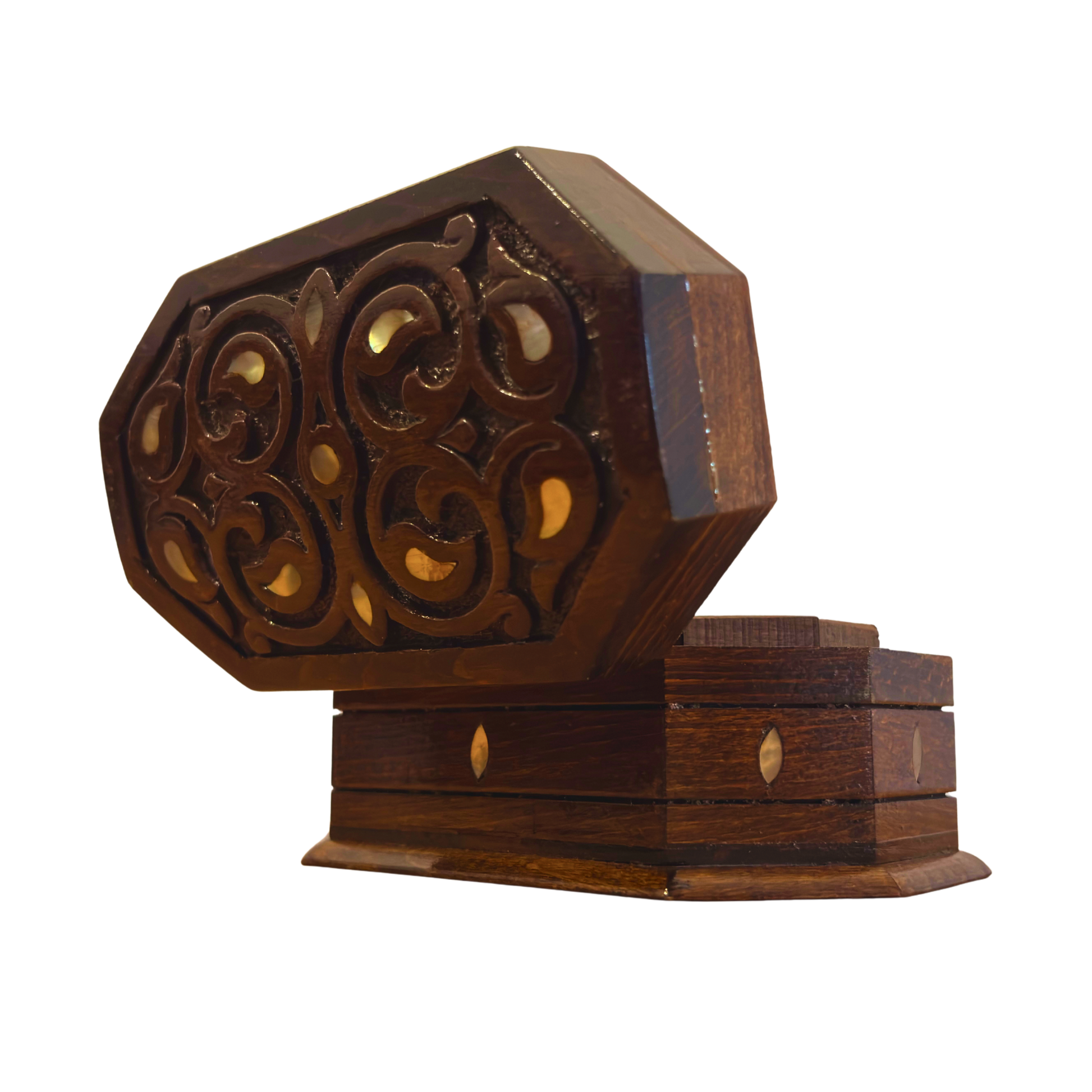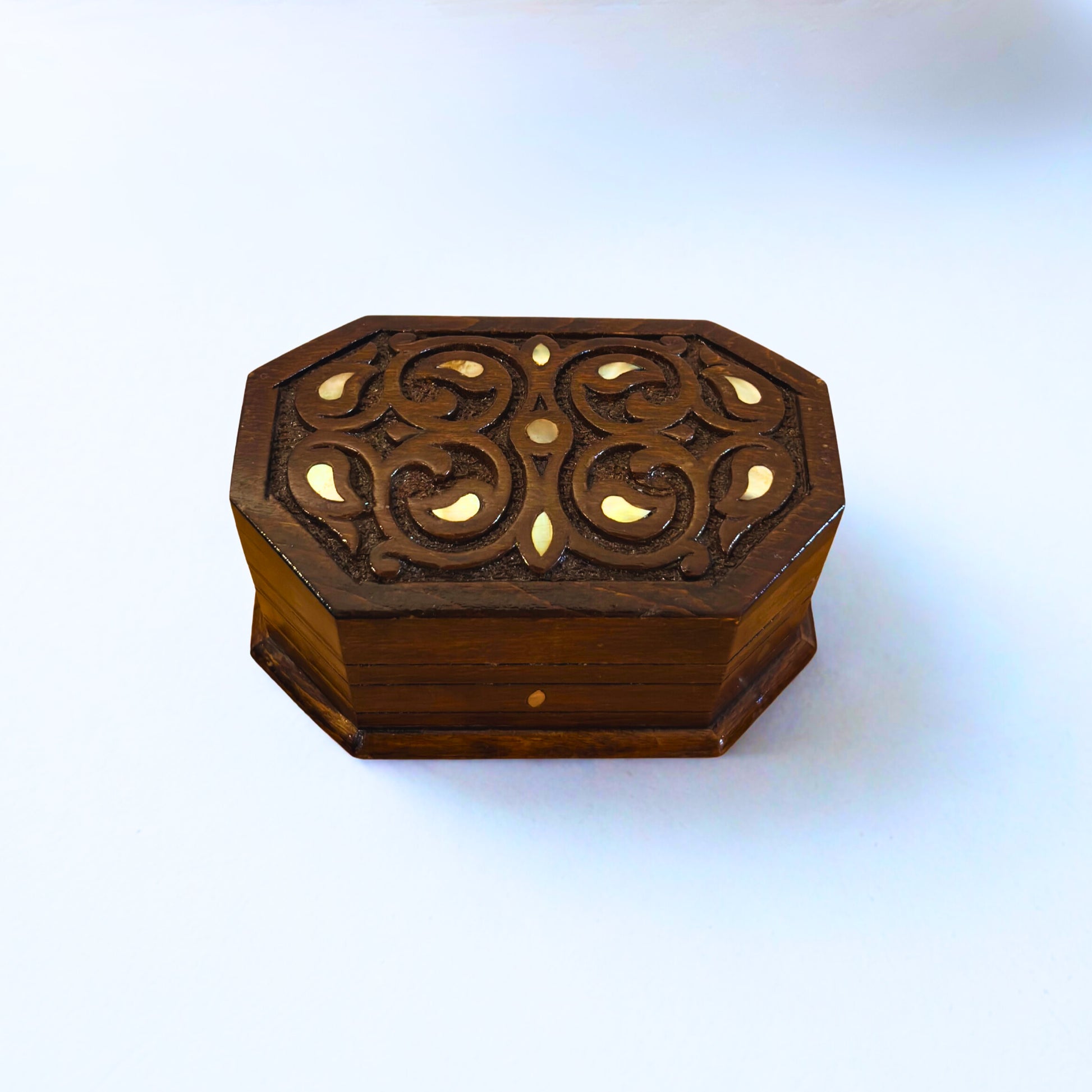 Handgeschnitzte Buchenholzbox mit Perlmuttintarsien – Elegante Walnussoptik