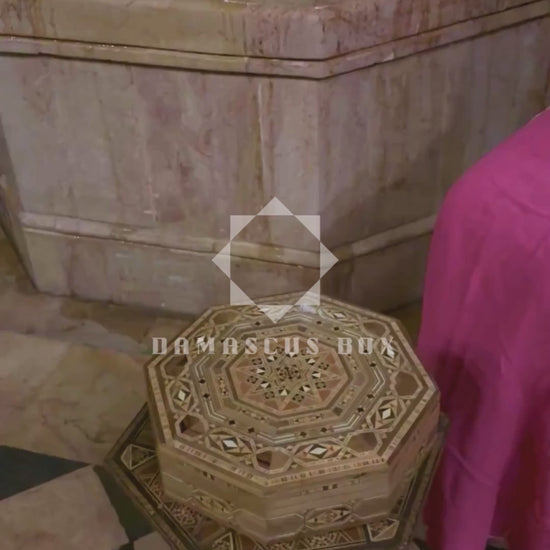 Esta elegante caja octogonal damasquina representa la precisión y la armonía del arte artesanal de Damasco.