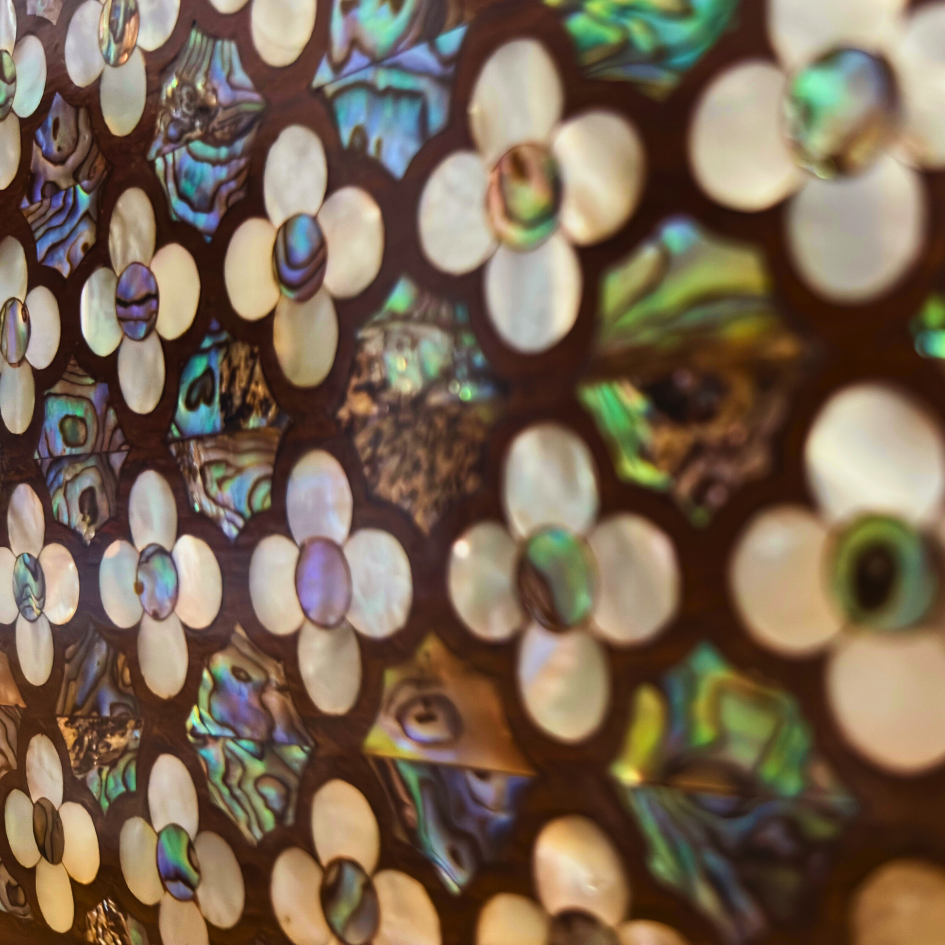 Realizzata a mano in pregiato legno di noce e decorata con rose in madreperla — una femminilità sofisticata scolpita da artigiani damasceni.
