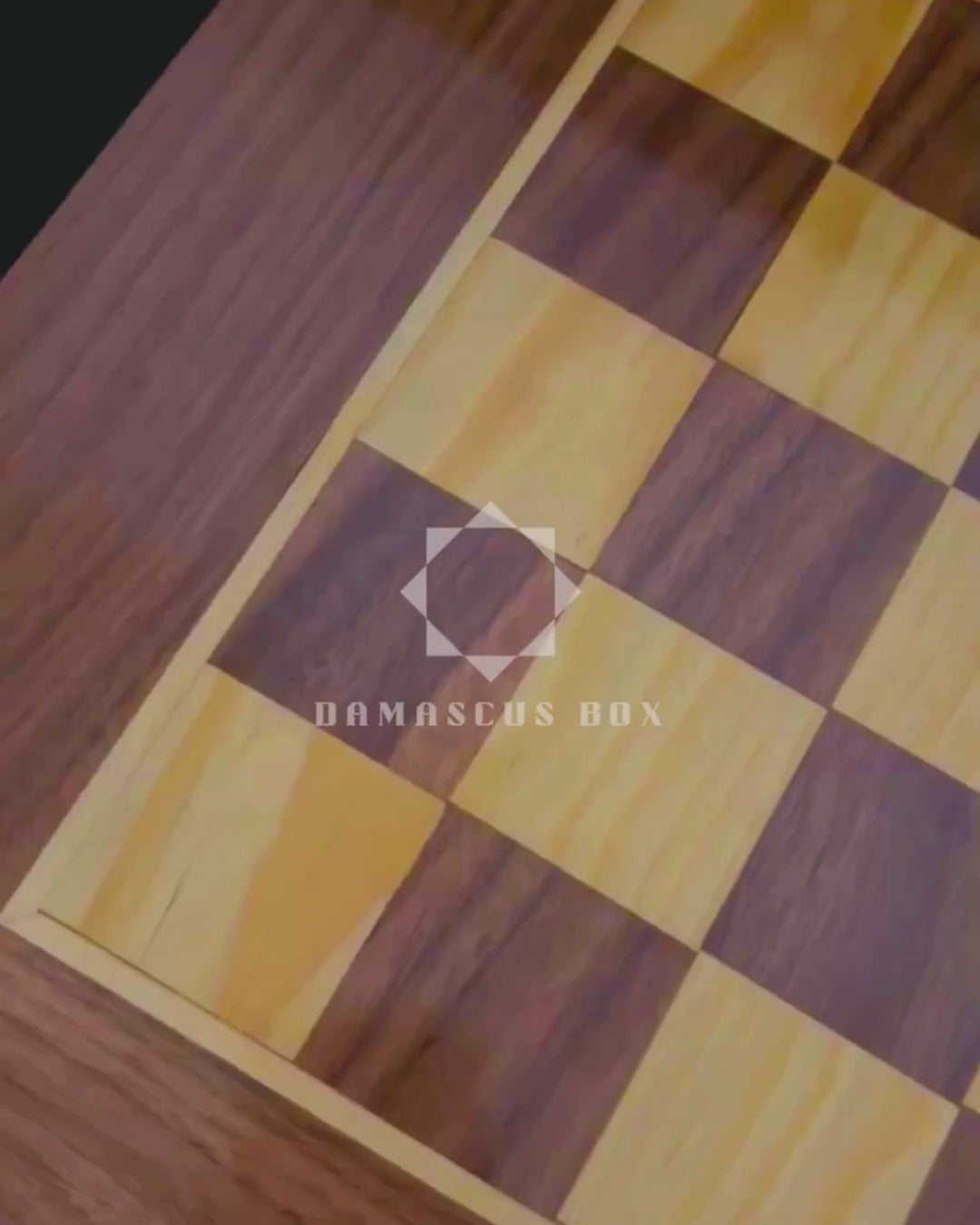 Meticulously crafted from walnut, lemon, rose, eucalyptus, and beechwood, this elegant table showcases the natural warmth and harmony of fine Syrian woodwork. The exterior features a classic chessboard pattern, while the interior reveals a stunning Damascene mosaic design — a tribute to centuries of artistic heritage.